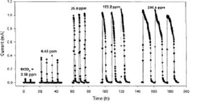 Hình 2. Đồ thị về quan hệ dòng điện sinh ra và nồng độ BOD ở một thiết bị cảm biến sinh học dạng pin nhiên liệu sinh học [11]. Ghi chú: Current: dòng điện (đo bằng mA); Time: thời điểm đo (h); BOD đo bằng ppm (một phần triệu) theo phương pháp BOD5