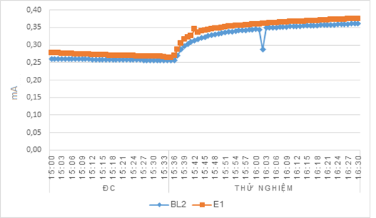 Hình 3. Kết quả đánh giá BOD của nước thải tại một làng tái chế vật liệu ở Bắc Ninh bằng 2 thiết bị cảm biến sinh học đánh giá BOD (MFC_BOD). ĐC: Các MFC_BOD được vận hành với nước thải đối chứng có giá trị BOD đạt yêu cầu (< 50 mg/L). THỬ NGHIỆM: Các MFC_BOD được vận hành với nước thải cần đánh giá. Kết quả cho thấy: khi thử nghiệm với nước thải cần đánh giá (có giá trị BOD là 550 mg/L vượt xa ngưỡng cho phép), dòng điện của các thiết bị tăng đột biến và các thiết bị đã phát tín hiệu báo động.