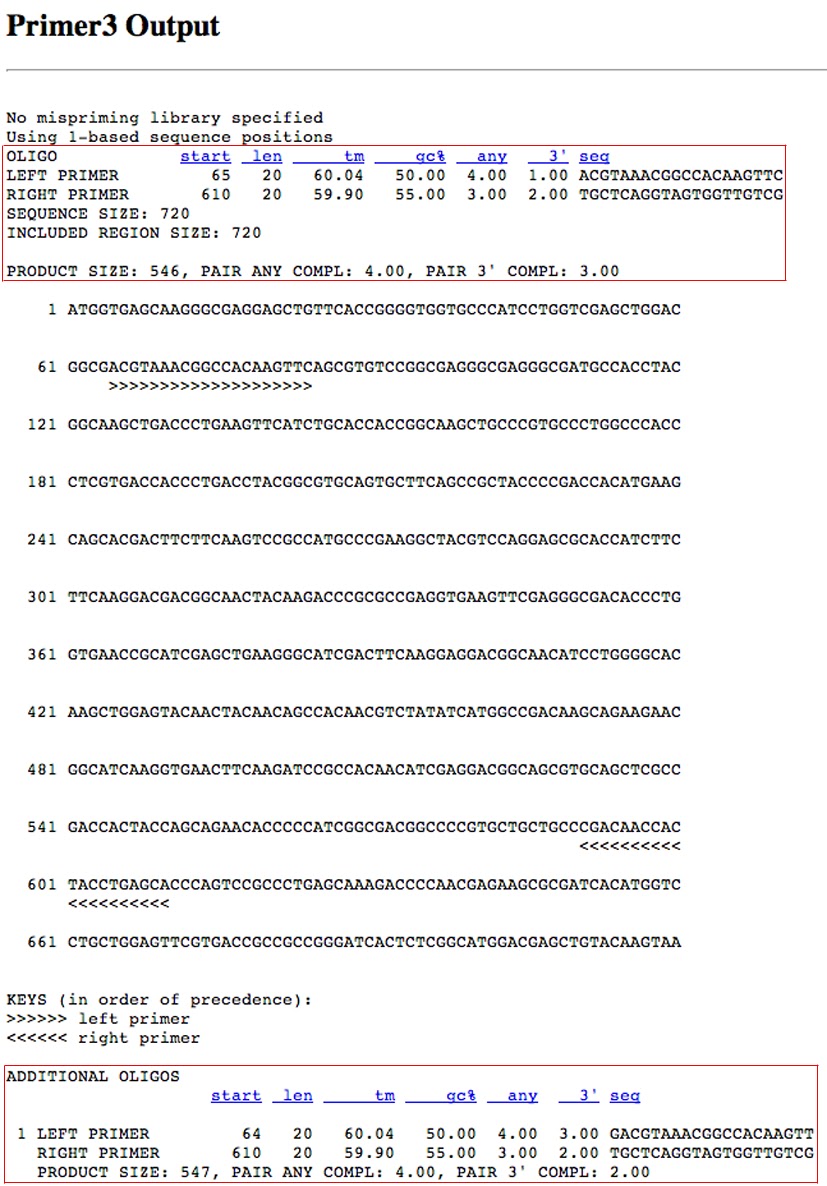 Dán trình tự của gene GFP (720 bp, trích xuất từ GenBank) vào khung cửa sổ chính của chương trình Primer3. Sau đó thay đổi một vài thông số như được chỉ ra trong khung màu đỏ để có được cặp mồi phù hợp.